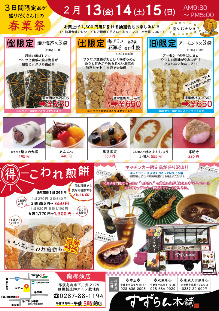 ✔特価のこわれ煎餅さらに大特価 ✔ 人気の缶煎餅20%オフ ✔ 苺大福感謝特価 ✔ 各日限定の目玉特価 ✔ 冬限定品のキッチンカーOPEN! ✔1,500円以上お買い上げごとに引ける 空くじなしの抽選会も♬ などなどご用意してお待ちしております! 【催事期間】1/24(金)~1/26(日)の3日間 【対象店舗】 南那須店(那須烏山市下川井2128) 0287-88-1194 詳細はコチラもご覧ください↓↓