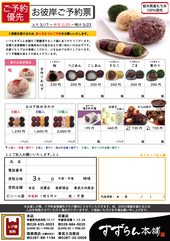 自慢の自家製餡は北海道十勝産の小豆を使用しており、 赤穂西浜の天塩を加えた深い味わいの美味しいおはぎです。 手握りならではの食感にこだわり、心を込めておつくりしております。 どうぞ感謝を添えてお供えくださいませ。 春のお彼岸限定の桜(こしあん入)おはぎもオススメです! 【販売期間】3/17~3/23 (彼岸入3/17-中日3/20-彼岸明け3/23) 【価 格】200円(桜:230円) 【賞味期限】おはぎ:当日 ご予約票はコチラをご覧ください↓↓
