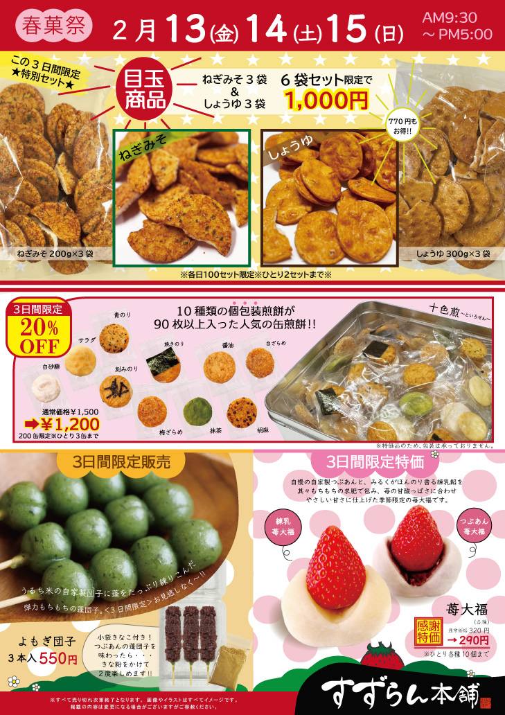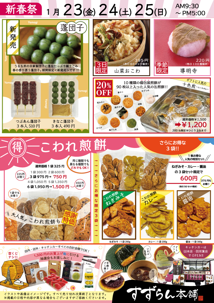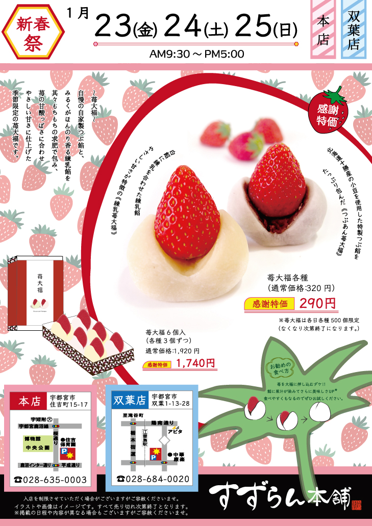 ✔苺大福 感謝特価 ✔ よもぎ団子新発売 ✔ 3日間限定の山菜おこわ ✔ 激安こわれ煎餅 ✔ 冬限定品のキッチンカーOPEN! キッチンカー:(金)本店/(土)双葉店 ✔1,500円以上お買い上げごとに引ける 空くじなしの抽選会も♬ などなどご用意してお待ちしております! 【催事期間】1/24(金)~1/26(日)の3日間 【対象店舗】 本店(住吉町15-17)028-635-0003 双葉店(双葉1-13-28)028-684-0020 詳細はコチラもご覧ください↓↓